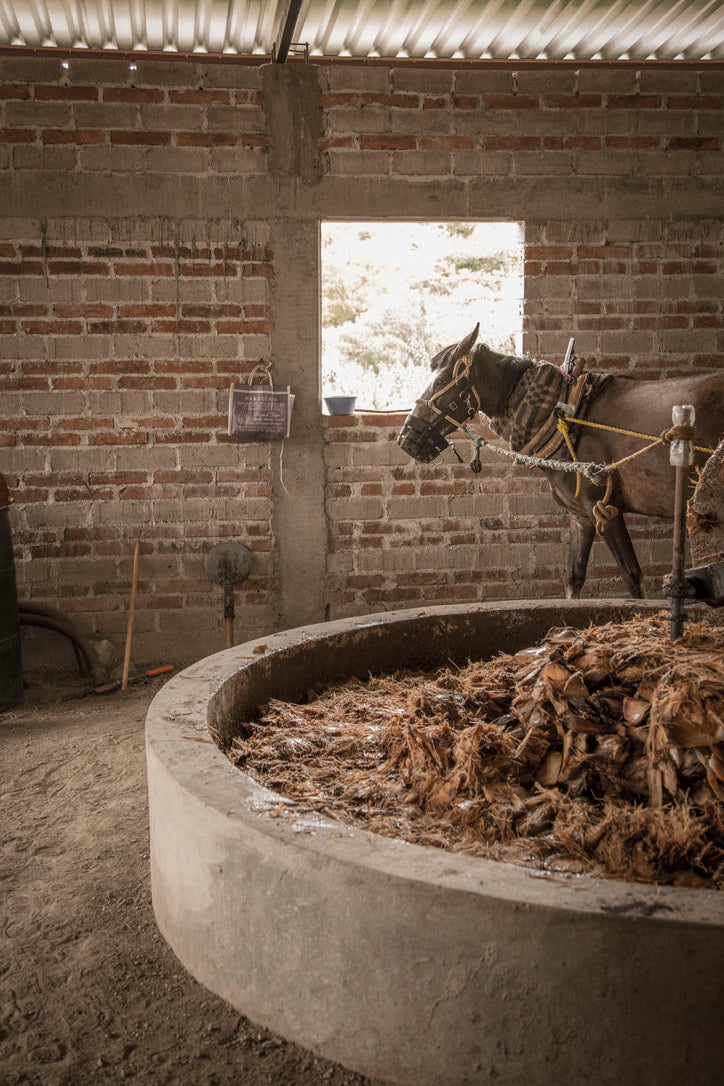 Hermosa, our beautiful horse, pulls the enormous tahona to create ample surface area for fermentation.